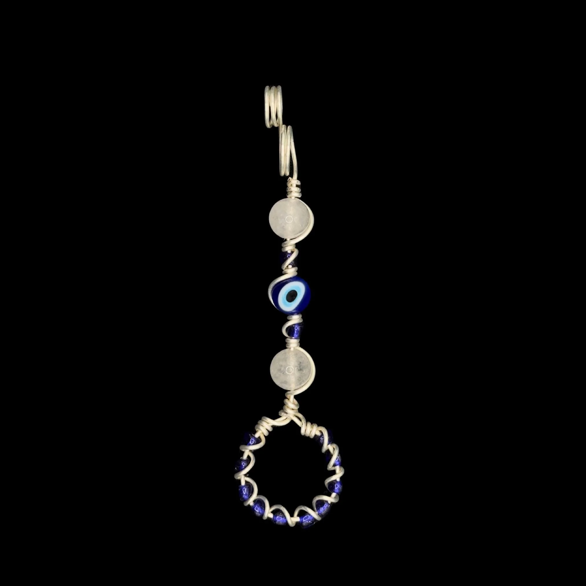 The Evil Eye design features glass Evil Eye beads and a variety of stones including Clear Quartz, Onyx, or Opalite.