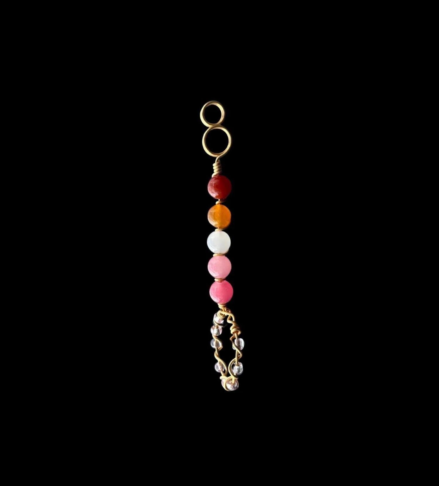 The Lesbian pride flag design features 2 shades of carnelian, a white Quartz, and two pink dyed Quartz.